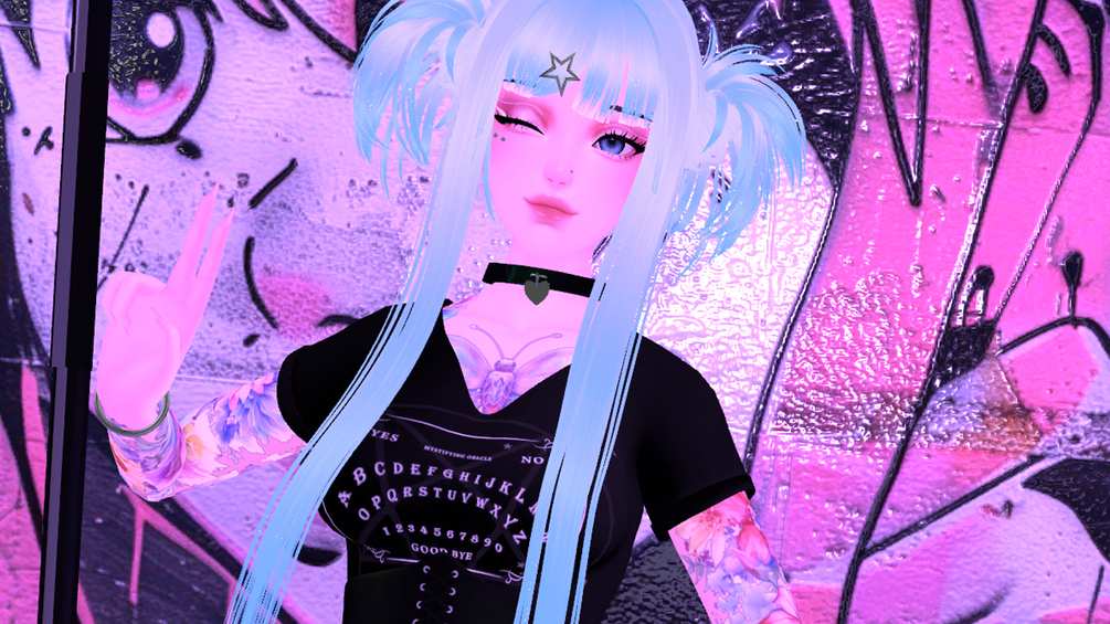 Head: Sivka - Body: Zinpia - Hair: Saikura - Face Texture: YingYangVR - Body Texture: HoneyLab - Tattoos: AskAmber - Eye Makeup: Pvddle - Corset Dress: Kold - Sneakers: Sohvi - Hair Texture: Cicieaaa - Socks: Darcy - Collar: TrixxedHeart - Bracelet: Shevi - Ouija: Rightmeow2 - Gogo Loco : Franada - Better Gestures: Kiri